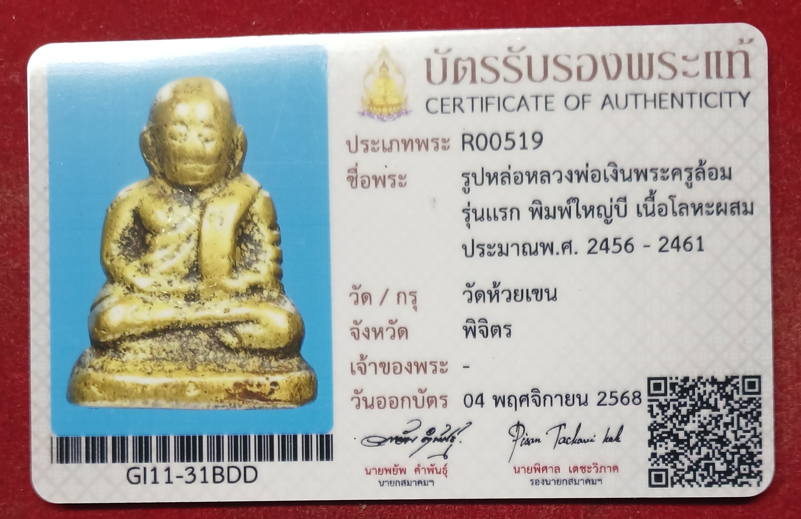 รูปหล่อหลวงพ่อเงินพระครูล้อมจัดสร้าง วัดห้วยเขน รุ่นแรก ป้2456-61 พิมพ์ใหญ่ บี. เนื้อโลหะผสม สวยเดิมๆ แท้ดูง่าย พร้อมใบเซอร์สมาคม