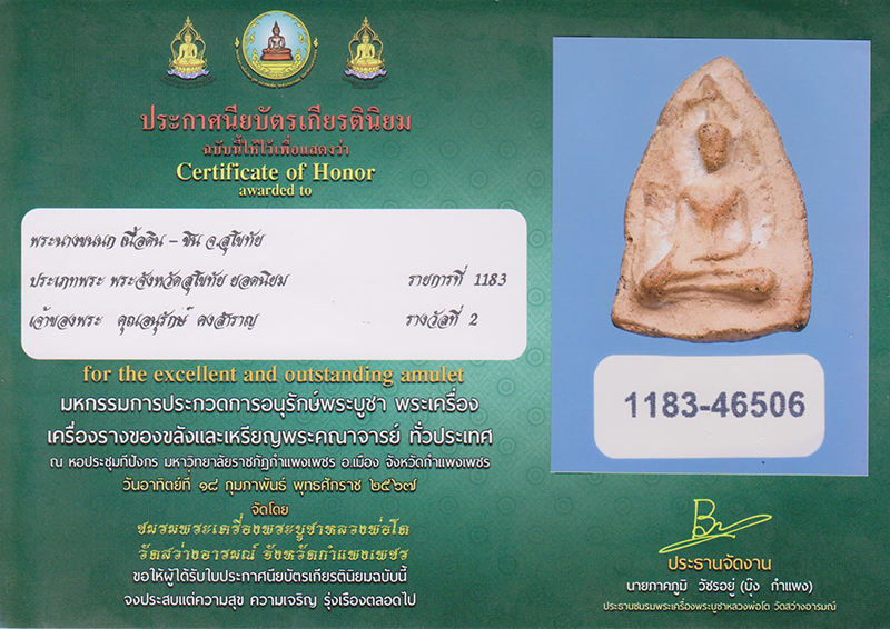 รางวัลที่ 2 จัดโดยชมรมพระเครื่องพระบูชาหลวงพ่อโต วัดสว่างอารมณ์