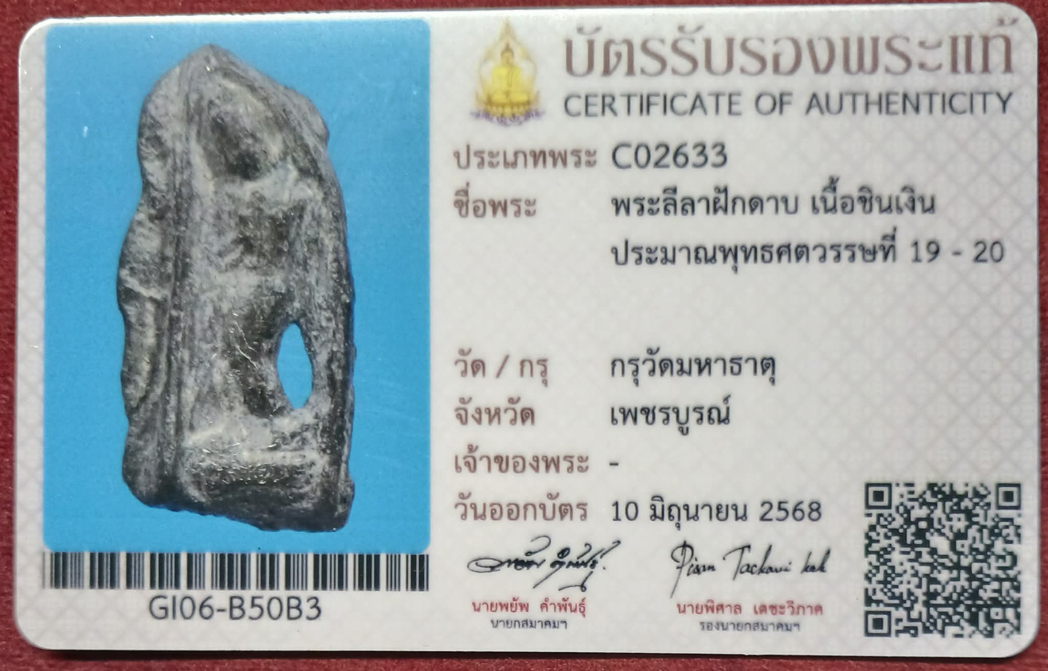 พระลีลาฝักดาบ กรุวัดมหาธาตุ จ.เพชรบูรณ์ เนื้อชินเงิน สวยเดิมๆ แท้ดูง่าย พร้อมใบเซอร์สมาคม